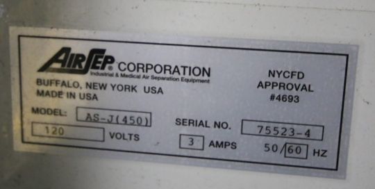 2008 Air Sep Oxygen Generator, Model AS-J (450), S/N 75523-4 with Steel Fab Aprox. 62" H x 24" W Air Receiver, S/N 511730, Less than 1,600 Hours