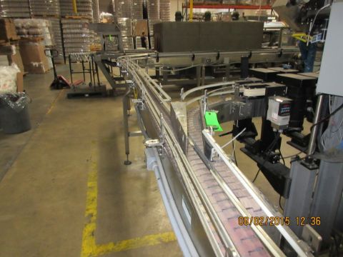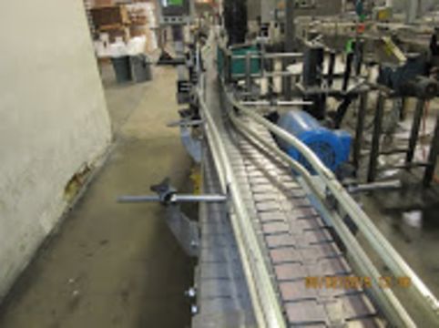 Table Top Conveyor 4.5" Wide Chain Belt, 28' of Straight Conveyor, (1) 90° Turn, 4' Transfer Box with 2HP Motor 480V