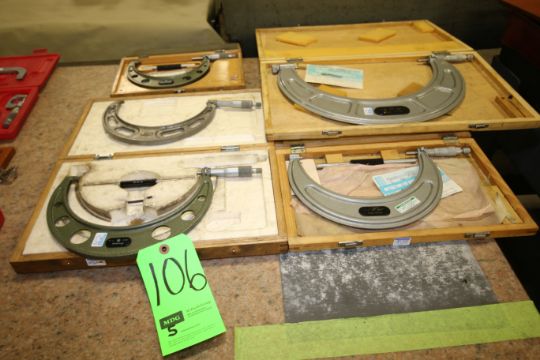 Assorted Micrometers - (3) Mitutoyo 5 - 6" - .0001"; 6" to 7" and 7" to 8" - .0001 and (2) Churn Brand 7 - 8" and 11 to 12" includes (4) Cases