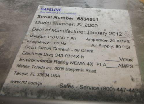 2012 Safeline/Mettler Toledo S/S Metal Detection/X-Ray Inspection System, Model SL2000, S/N 6834001 with Aprox. 34" x 4-1/4" L Teflon Coated Opening, Mounted on 7 ft. L Power Belt Conveyor with 34" W Intralox Type Belt S/S Frame includes Digital Read-Out , S/S Clad Drive Motor and VFD Controller (FADP -- Located in New Mexico)