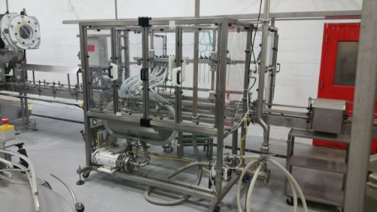 2011 Inline Filling System 8-Valve Pressure Filler, Model FOFNT72 includes Nitrogen Gas Flush System with S/S Jacketed Holding Tank, WCB Centrifugal Pump, Plexiglass Enclosure, Valves, Controls and Mounted on Aprox. 15 ft. Inline S/S Bottle Conveyor