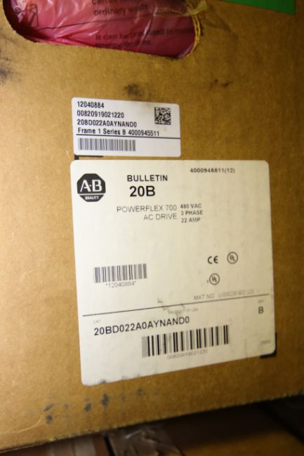 NIB Allen Bradley 15 hp PowerFlex 700 VFDs, Cat #20BD022A0YNANDO, 480 V, 3 Phase, Bul 20B, Series B, Frame 1