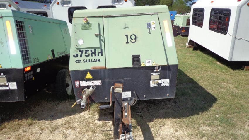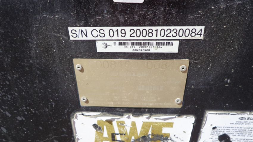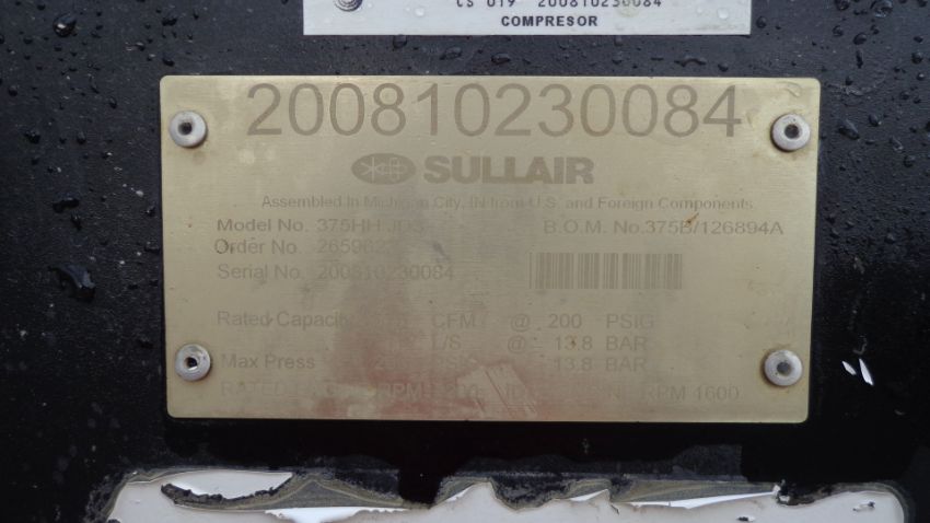 Sullair Portable Compressor, S/N CS-019 / 200810230084, Model 375 HH, Rated 375 CFM @ 200 PSIG, John Deere Diesel Engine, 177 L/S @ 13.8 BAR, Rated Engine 2200 RPM, Idle Engine 1600 RPM, Digital Hour Meter