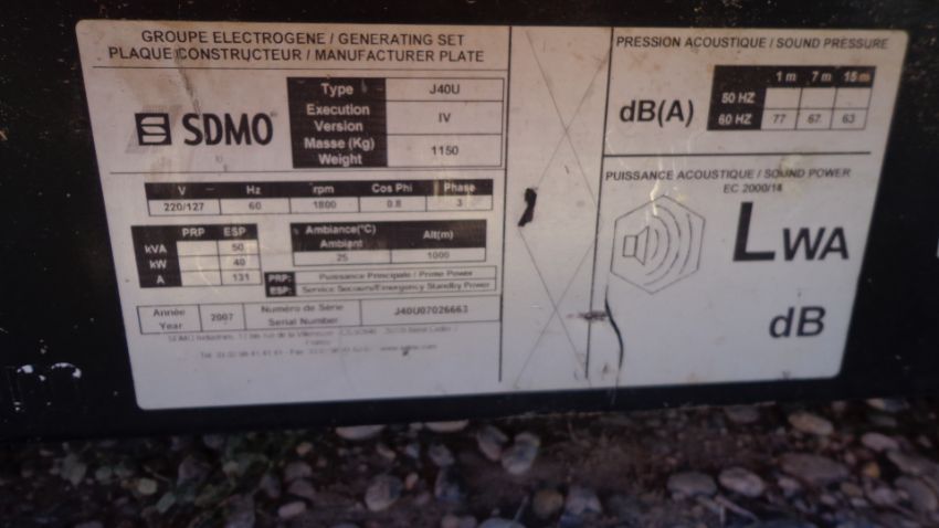 2007 SDMO Type J40U Generator with John Deere Diesel Engine, S/N J40U07026663, 50 KVA, 40 KW, 220/127 V, 60 Hz, 1800 RPM, 3 Phase