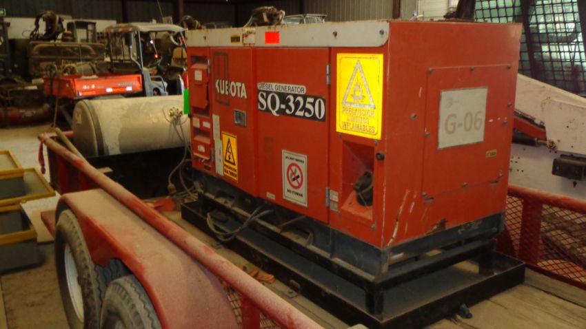 Kubota Generator with Kubota Diesel Engine, Model SQ-3250-USA-SW, S/N H100656U3870, 25 KVA, 20 kW @ .8PF, 240/480 V, 60 Hz, 60.2 / 30.1 Current, Rated Speed 1800 min, 3 Phase, 4 Poles, Mounted on Tandem Axle Trailer with Fuel Tank