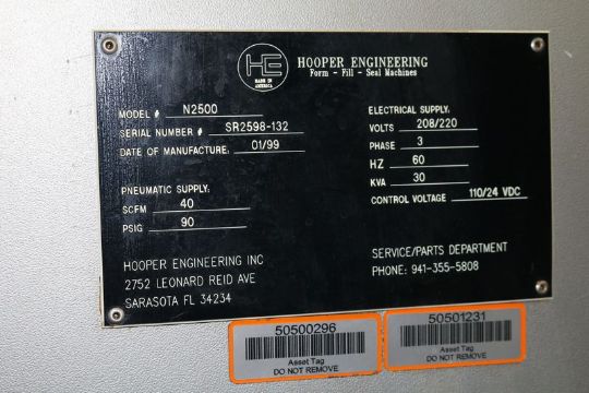 Hopper Engineering Form, Fill, and Seal Machine, Equipped with Vacuum Pump, M/N N2500, S/N SR2598-132, 208/220 Volts, Formly filled Icing Packs (CON-SALE PRICE INCLUDES FOB)(LOCATED IN PITTSBURGH, PA)
