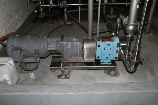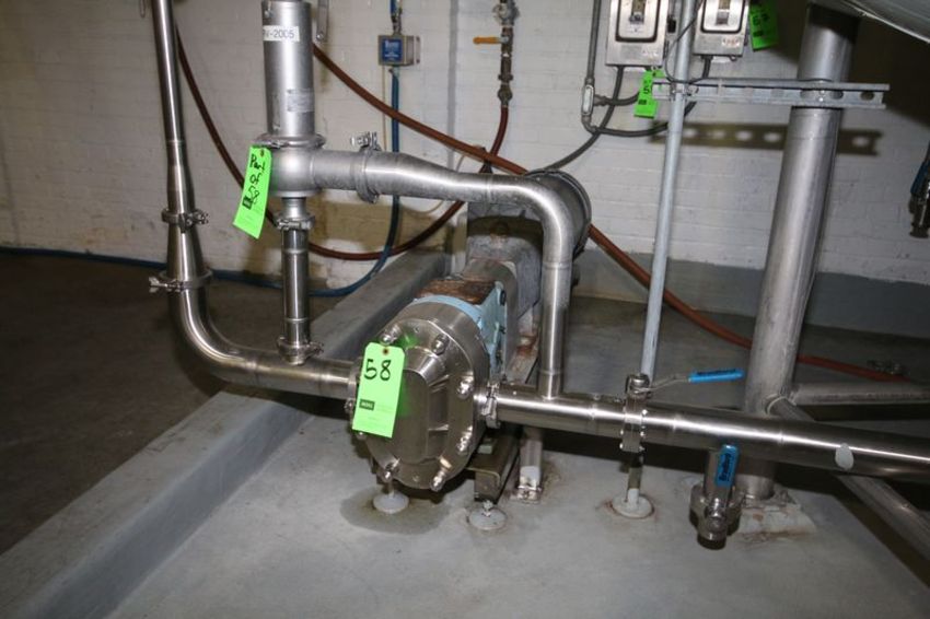 Waukesha 20 hp Positive Displacement Pump, M/N 13042, S/N 350890, 3" x 3" Clamp Type Head, 1765 RPM Super E Motor, 3 Phase, Includes Recirculating Valve and Butterfly Valve, S/S Square D 60 AMP Safety Switch