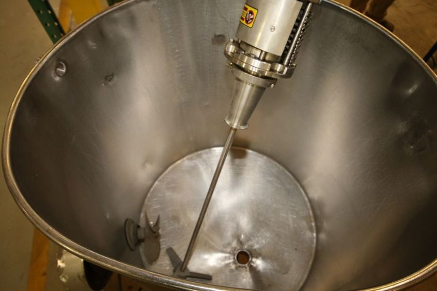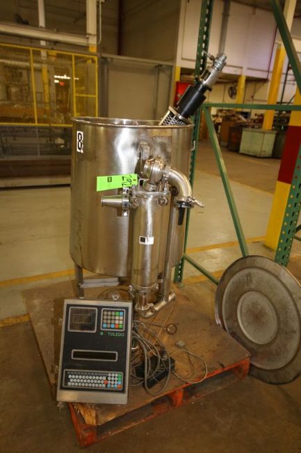 S/S Mix Tank with Side Mount 0.5 hp Agitation and Top Mount Lighning Agitator, 28" Tall x 27" Wide, Tank Mounted Skid on Wheels, On-Line Filter, Mettler Toledo Read Out, Associated Valves and Fittings