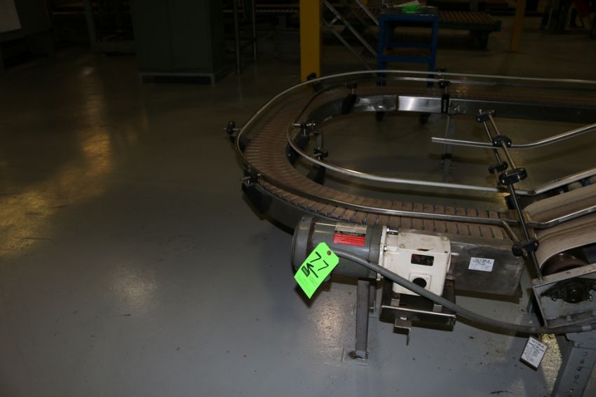 Aprox. 30ft. Long x 8" Wide Case Conveyor with Guide Rails, Straight Sections, Drives, and 90 Degree Turn