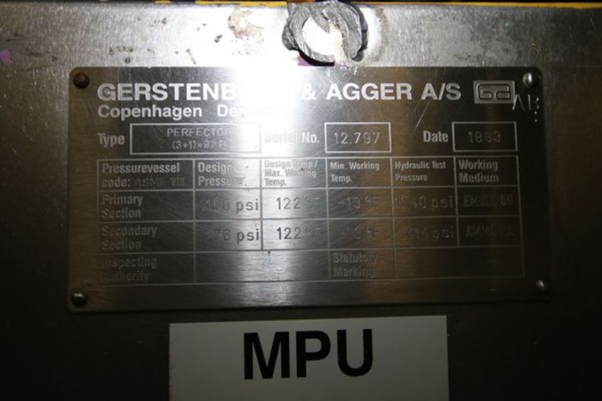 Gerstenberg 4-Barrel Scraped Surface Heat Exchanger, Type (3+1) x 92R, S/N 12.797, Ammonia Cooled, with (2) Leeson 50 hp Drives