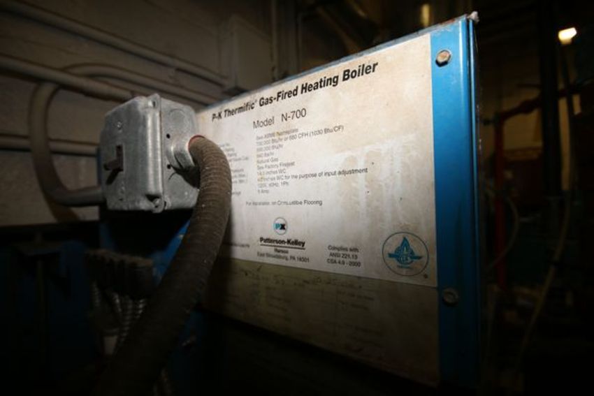 Patterson-Kelley Harsco Hot Water Recuit System, M/N N-700, Input Rating 700,000 BTU/Hr, Output Rating 595,000 BTU/Hr, Natural Gas, with Related Piping, Pumps and Valves (Help Keep Oil Hardening in Silos in Winter Months)