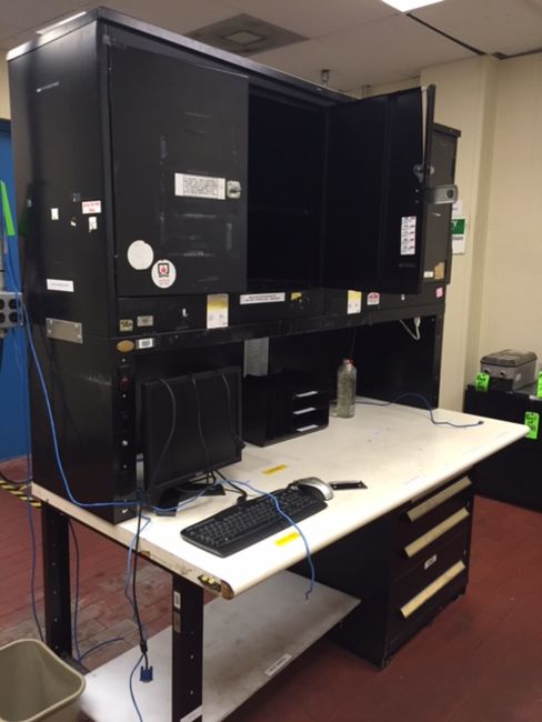 Contents of Electrical Room, Including Manager's Desk, 5-Shelf Parts Cabinet, (2) Horizontal Filing Cabinets, (2) Server Cabinets, (1) Switch Panel Cabinet, (2) Dell Monitors, E-Trac AC Inverter, Allen-Bradley Power Flex 700, Work Bench with Drawers, Table, Chairs, and a Sentry Safe (NOTE: Ferrups Transformers and Related Equipment NOT FOR SALE)