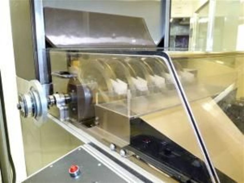 L. B. Bohle KA200 automatic tablet thickness sorting system. Variable speed cotrols with On/Off, Keyed Switch and E-Stop, cover is safety interlocked. Thickness is controled by 6 sets of adjustable discs from 5mm to 20mm. All six sets are adjustable with one handwheel or individually by micro adjustable screws. Tablets are automatically separated into three separate areas of too thin (deposited into lower stainless steel pull pull drawer), too thick (deposited into plastic upper removable receptacle) or good (exits through outlet chute into your container). Hopper has capacity of 40,000 5 gram tablets. Machine is mounted on casters for portability. Dimensions 1300 x 1800 x 1800 mm ht Weight: 300 kg***CPPS***