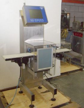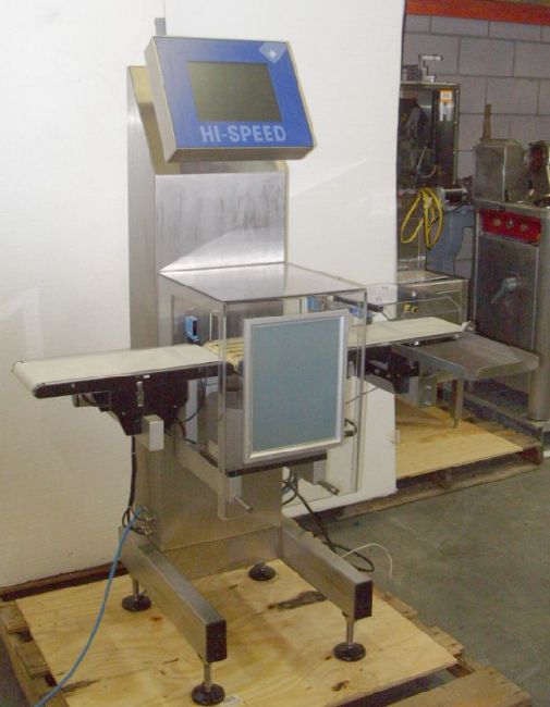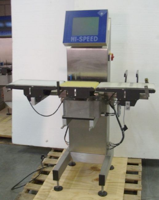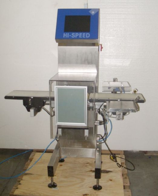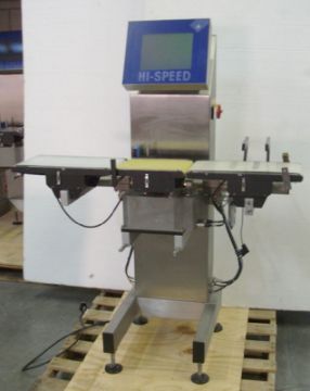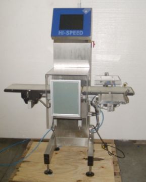 Mettler Hi Speed Model RX-2 Check Weigher, set at 100 Gram Capacity for up to 300 parts per minute. Accuracies of +/- 50mg. Triple belt feed system as follows: infeed, load cell and outfeed conveyor with a total 43" length x 6" wide. Moves objects from left to right. Weight cell capacity of up to 100 grams. Rated for up to 400 pieces per minute. High Contrast, High Resolution TouchscreenLCD Display. 100 product memory with programmable over/under weight, throughput, tare, visual gliding. Counter that tracks number correct, over weight and underweight. Belt speeds vary from 10 to 59 meters per minute. Serial port. Password protection. Fitted with 7,000 gram load cell. Automatic Sorting/Rejecting (Air Reject/Blowoff) Stainless Steel Framing Last used in Pharmaceutical industry. Parts machine only***CPPS***
