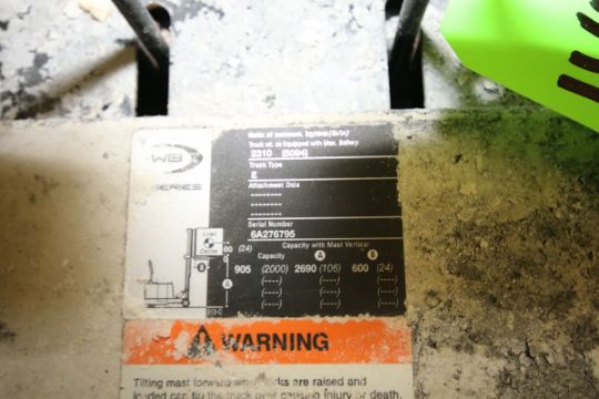 2010 Crown Aprox. 2,000 lb. Capacity 24-V Walk-Behind Forklift, WB Series, Truck Type E, S/N6A276795 with 106" H Lift (Unit #C13) and Hobart 24 V Battery Charger (Unit #4-16)
