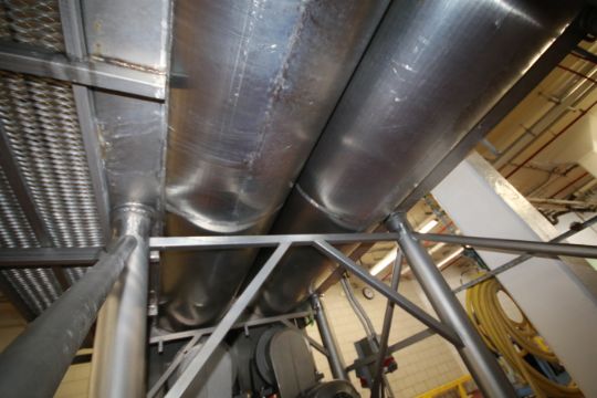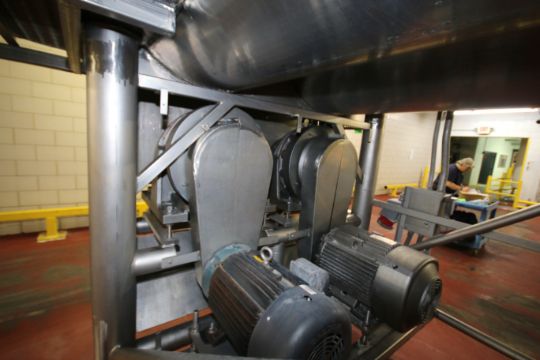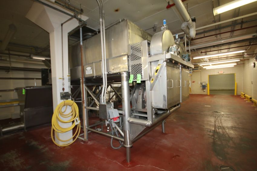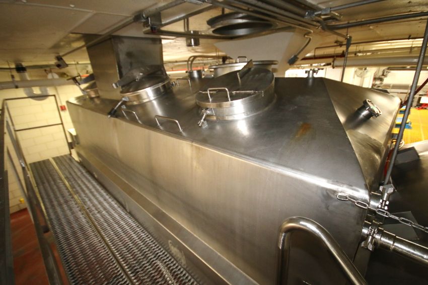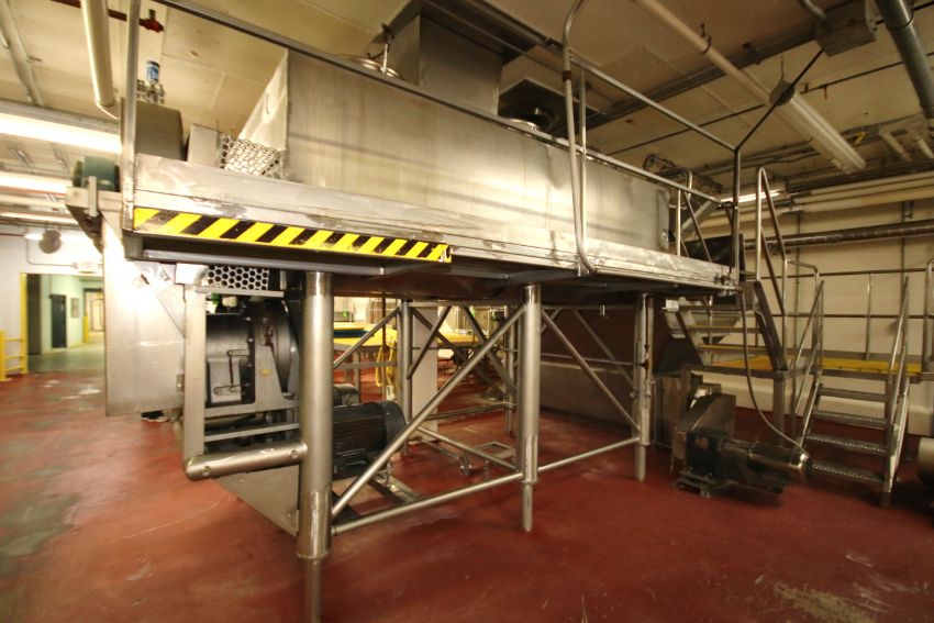 Crepaco Aprox. 10,000 lb. Capacity Twin Screw Ribbon Blender with 36" Twin Screw, Enclosed Top, Interior Dimensions Aprox. 50" Deep x 75" W x 144" L, Pneumatic Hinged Lid, Pneumatic Discharge, (2) 40 hp Motors, 1765 RPM, 230/460 V, 3 Phase and S/S Operators Platform including Platform on Side and Surrounding Front of Blender (Note: Platform Must Be Cut) (Middle System Blender)