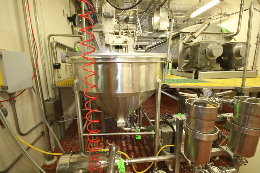 Aprox. 150 Gal. (Aprox. 27" H x 46" Dia.) Hinged Lid Single Shell Cone-Bottom Portable S/S Hopper/Kettle, Model 1200, S/N 9111-7712 with Scrape Surface Agitator, Ball Valve and Chain Block (Line 16 Hot System)