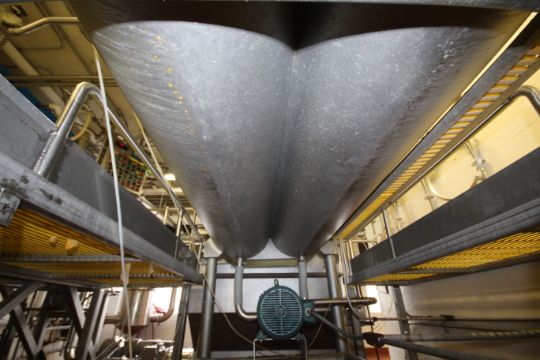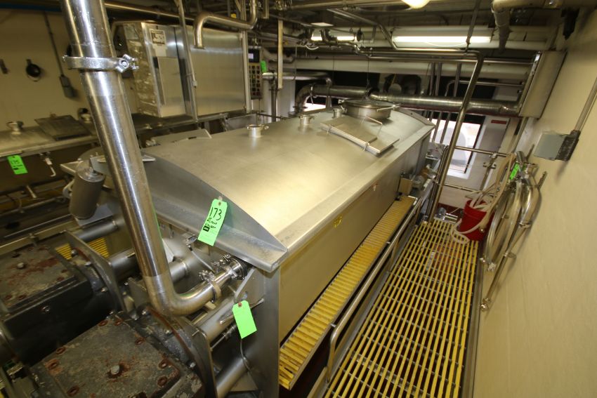 2005 Mepaco 4,000 lb. Capacity Twin Screw Ribbon Blender, Model 170, S/N 1412066 with 26" Ribbon Auger, Interior Dimensions Aprox. 34" H x 52" W x 126" L, Pneumatic Lid, Pneumatic Discharge, High Polished Interior, (2) 20 hp Motors, 240/460 V, 3 Phase, Onboard Tri-Clover Centrifugal Pump, Operators Platform including S/S Sprayball CIP Manifold (Line 16 Hot System) Wall Opening Fee of $2,000 to be added to invoice. Rigging charges additional.