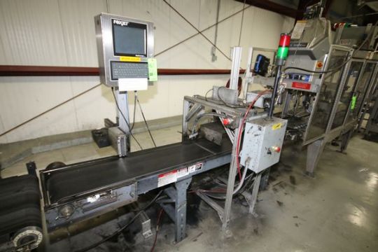 { Group of lots: 459,460,461 } Fox Jet Marksman Pro Box Coder, S/N MKP91801951 MKPRO with (2) Heads, Mounted on S/S Stand with Aprox. 105" L x 12" W Box Orienter/Belt Conveyor (Line #33)