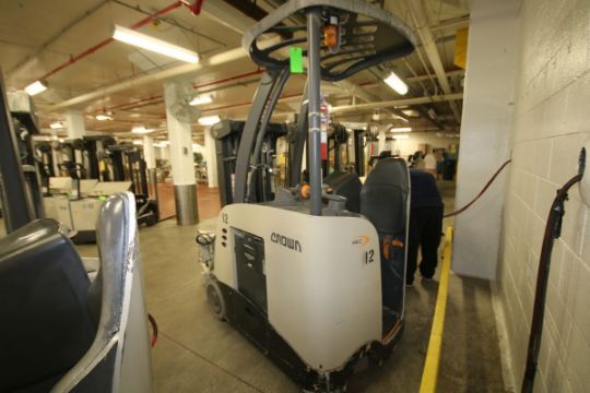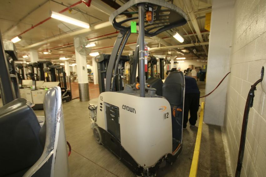 { Choice of lots: 140,141 (P) } 2011 Crown Aprox. 3,000 lb. Capacity 36-V Stand-Up Forklift, Model RC5535-30, S/N 1A427022 with 2-Stage 154" H Lift, Cascade Rotary Barrel Attachment (Unit #12) and Exide 36 V Battery Charger (Unit #4-1)