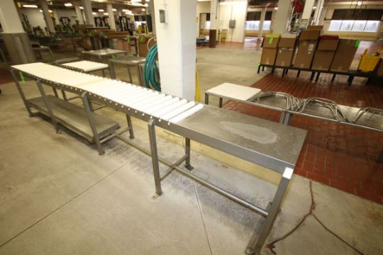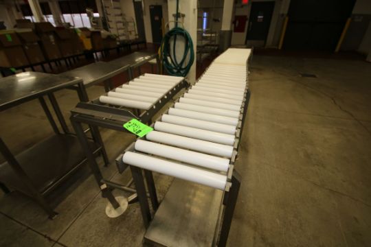 (2) Pcs. - S/S Roller Conveyor System with Teflon Rollers and Built-In Pack-Off Table, (1) Section Aprox. 13 ft. 8" L x 16" W and (1) Section 3 ft. L x 16" W