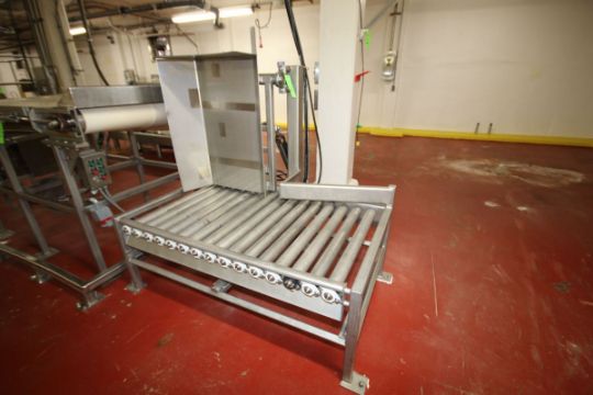 Barrel Lift System with Aprox. 21" W x 40" L x 20" Deep Hydraulic Lifter, Mounted on Aprox. 5 ft. L x 34" S/S Roller Conveyor including Hydraulic Pump with Reservoir (North Grinder)