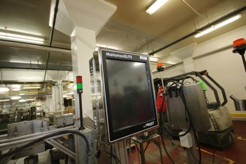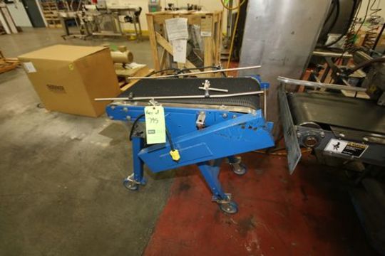 { Group of lots: 794,795 (P) } FoxJet Marksman Ink Jet Coder, S/N FXJT 50101637 MK ELITE with (2) Project Series 768 Heads, Mounted on Stand with Titan Belt Conveyor, Box Orientor, Skate Conveyor and Portable Power Belt Conveyor (Line #22)