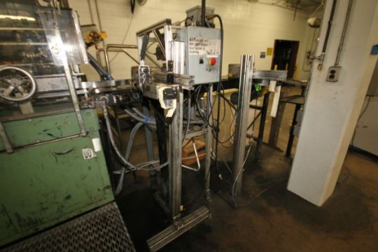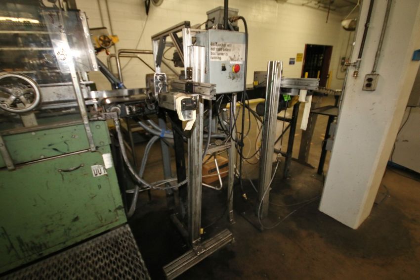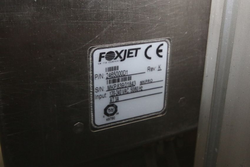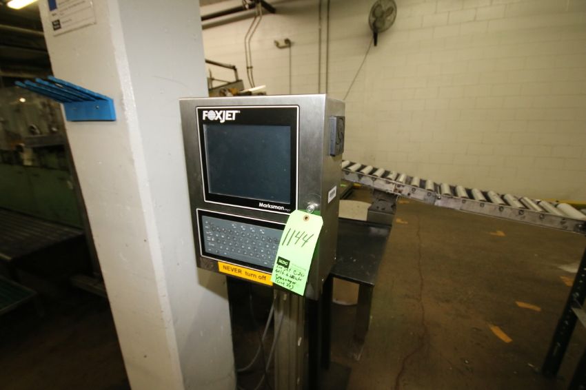 { Group of lots: 1140,1141,1142,1143,1144 } FoxJet Marksman Pro Ink Jet Coder, S/N MKP83901843 MK PRO with (2) Project Series 768 Heads, Mounted on Stand with Aprox. 115 ft. Belt and Skate Conveyor and Box Orientor (Line #24 Case Packer)