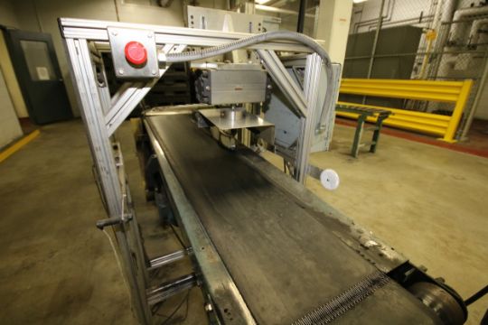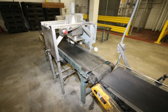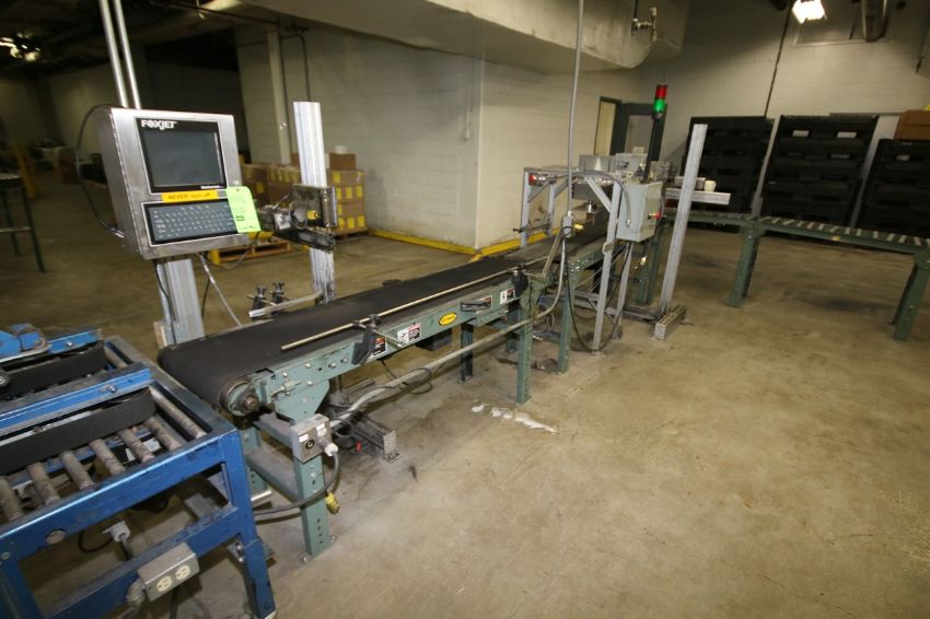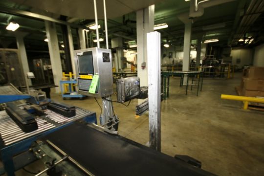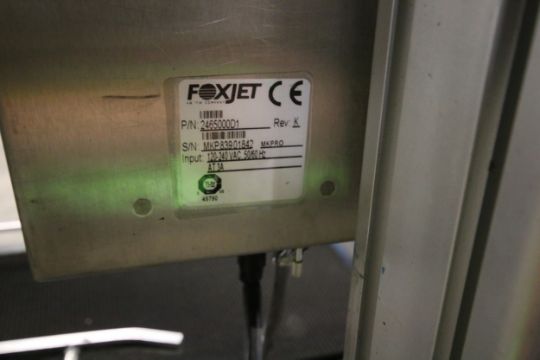 FoxJet Marksman Pro Ink Jet Coder, S/N MKP83901842 MK PRO with (2) Project Series 768 Heads, Mounted on Stand with Aprox. 60 ft. Hytrol Belt and Infeed/Outfeed Skate Conveyor, Box Orientor and Conveyor Stands (Line #21)