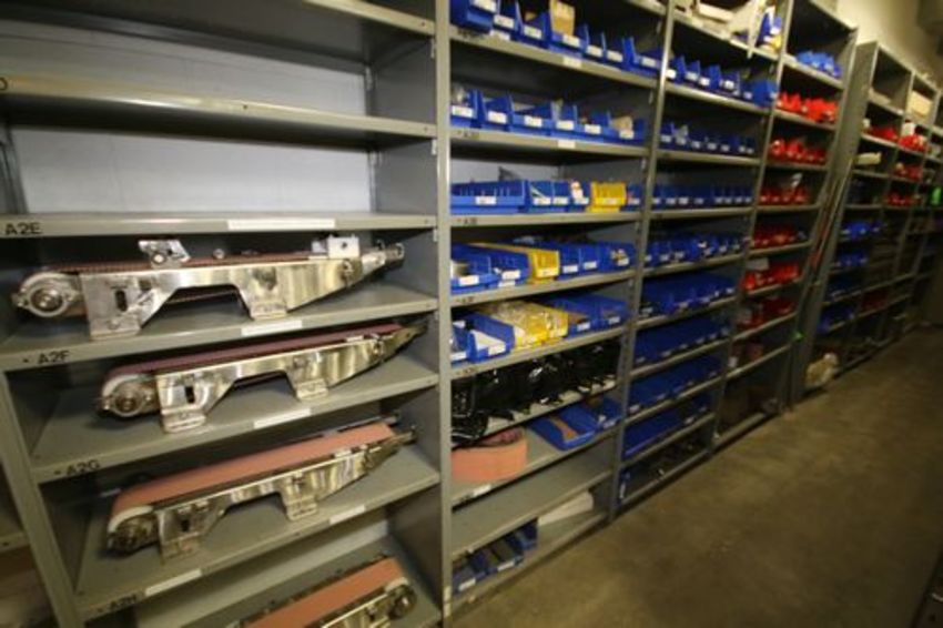 Contents of (8) Racks Only of Casting Line Parts including: Drive Parts, Belts, Spindles, Bearings, Shafts, Clutch Parts