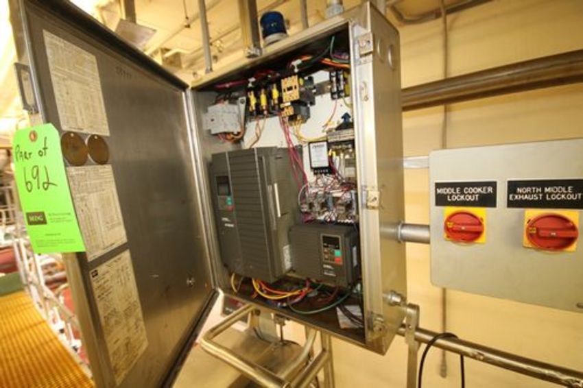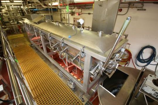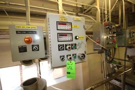 { Group of lots: 692,692A (P) } Aprox. 12 ft. L x 24" W x 14" Deep S/S Cooker with 8" W Dual Augers, Mounted on Load Cells with Digital Read-Out, Control Panel with (2) Fuji VFD's and Badger PC100 Batch Meters, CIP Manifold, Chain Block and Operators Platform (Middle System Cooker)