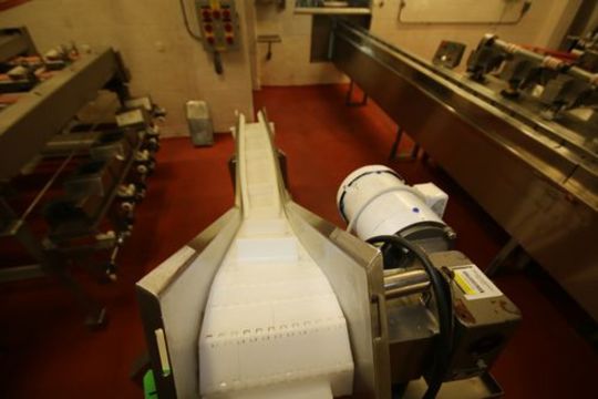 Marchant Schmidt Aprox. 8 ft. L Portable Incline Rework Conveyor with 1/2 hp Drive and 8" W Intralox Belt with Flights (Line #23)