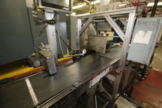 FoxJet Marksman Elite Ink Jet Coder, S/N FXJT 50101617 MK ELITE with (2) Project Series 768 Heads, Mounted on Stand with Titan Belt Conveyor, Orientor and Outfeed Skate Conveyor (Line #24)