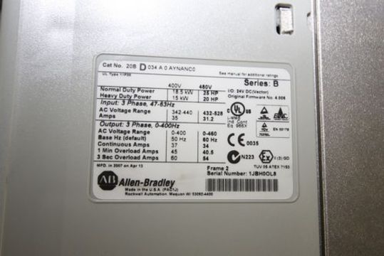 { Choice of lots: 606,607 (P) } New Allen Bradley 20-25 hp PowerFlex 700 VFD, Cat #20B-D034A0AYNANCO, Series B, Frame 2, 400/480 V, 3 Phase