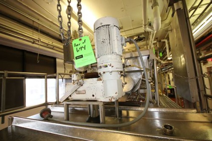 CFR Aprox. 100 Gal. Hinged Lid Cone-Bottom S/S Portable Kettle/Hopper Tank with Agitator, S/S Stand with Plastic Grating and Chain Block (Tank Dimensions Aprox. 45" W x 12" H) (Middle Cooker)