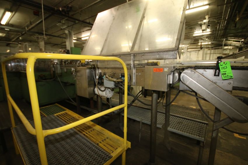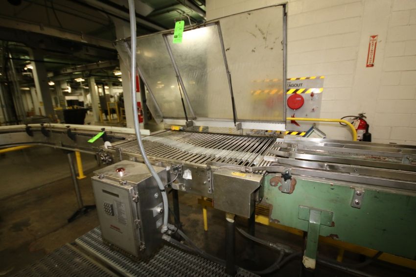 { Choice of lots: 1155,1156 } Hi-Speed Magnetic Flow Director Conveyor, Aprox. 56" L x 34" W with Allen Bradley MicroLogix 1000 PLC Controls and Plexiglass Enclosure (Line #24 Case Packer)