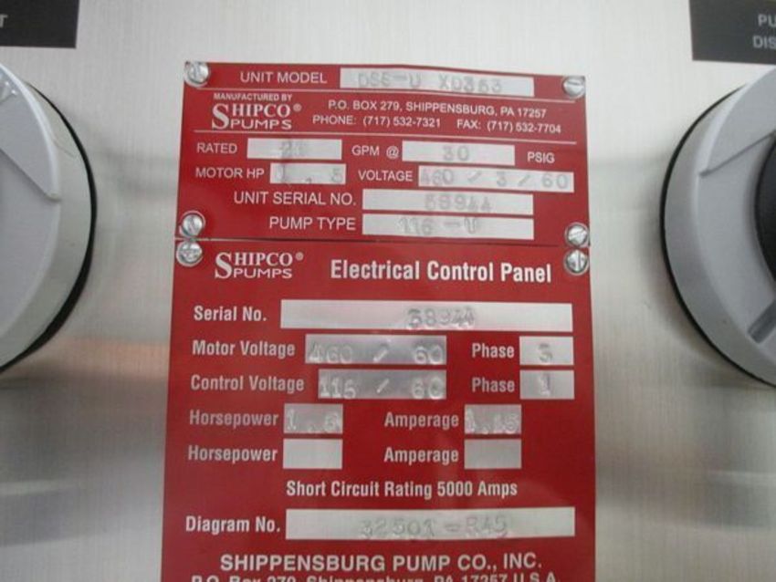 Duall Condesate return pump - Unit Model DSS - U X0353, 1.5 Hp, Voltage 460/3/60, Electrical Control Panel S/N 58944, Motor Voltage 460/60, 3Ph Control Voltage 115/60, 1Ph,1.5HP, Model: DSS-U- X0353, Serial Number: 58944