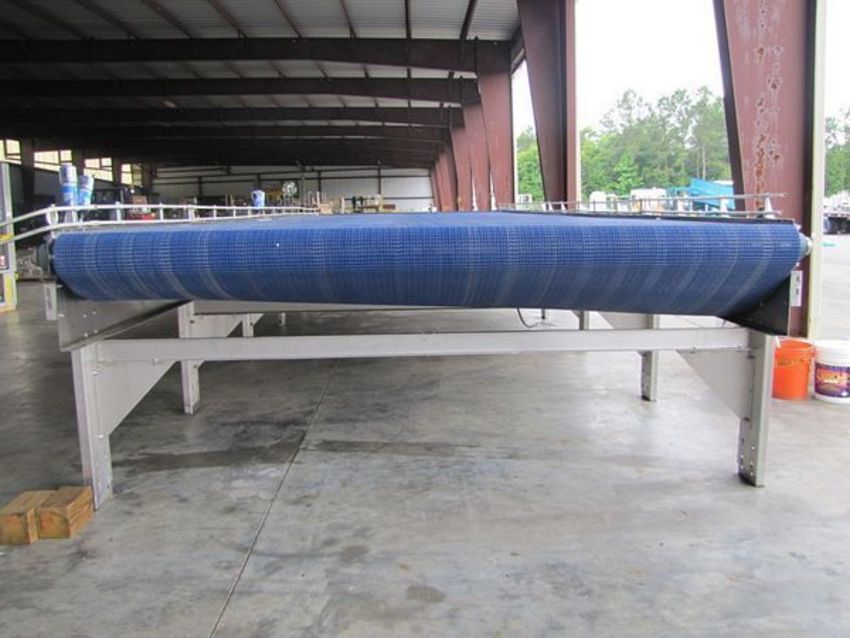 Ambec Stainless Steel Frame, Bi-directional Center Drive Intralox Plastic Belt, Includes Rails and Legs, discharge conveyor available at additional cost, Model: 8x30, 10’W x 30’L & overall dimensions are 11’W x 30’6”L