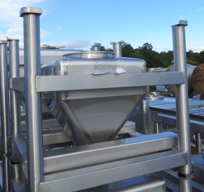 Tote Inc 10 CFT Bin. 75 Gallon Capacity, Stainless Steel. 32" X 28" X 12" Straight Side with a 21" Cone and 10" Diameter Discharge. Mounted on a Stackable Fork Lift access frame. 18" top-mounted manway.(Located in Hainesport, NJ) ***NYINC***