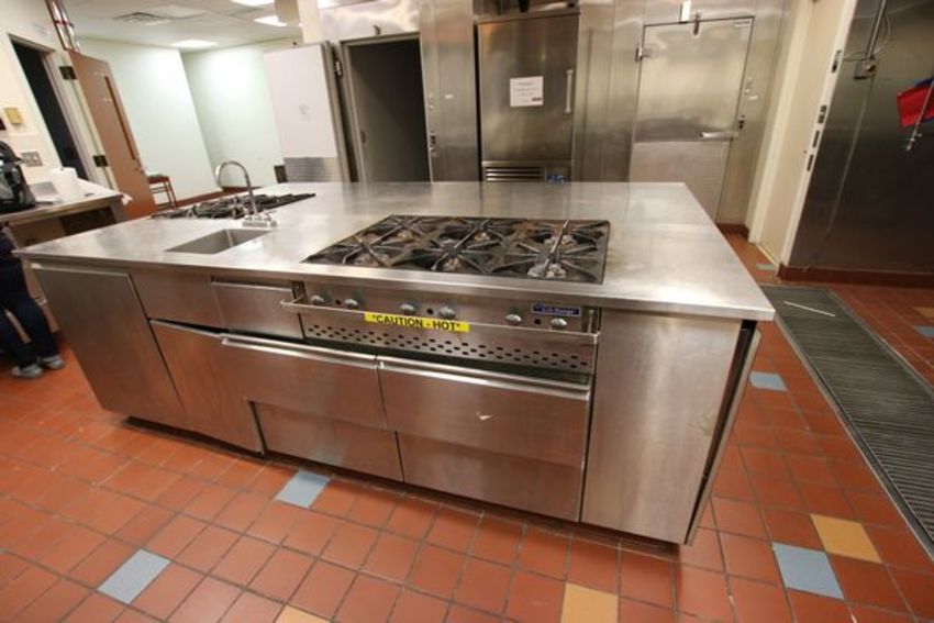 U.S. Range S/S Island with (1) 4-Burner Gas Stove, (1) 6-Burner Gas Stove, Small Single Bowl Sink, Multiple Drawers and Cabinets, Power Outlet, Approx 106" L x 66" W