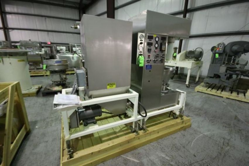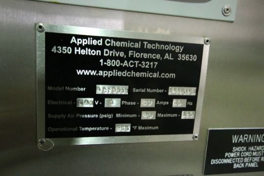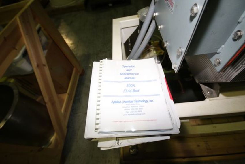 Applied Chemical Technology 300N S/S Fluid Bed System, Model 300N, S/N 4890901, Batch Size Range 5L to 20L, Fluidization Velocity 40 to 500 feet per minute, Inlet Air Temperature Ambient to 250 Degrees F., Fluid Bed Area 0.44 sq.ft. includes Baldor 3 hp Motor, 3460 RPM, 230/460 V, 3 Phase, Filters, Gaskets and Housings (Designed for Small Scale Spray Coating, Granulation and Drying of Particles and Powders)