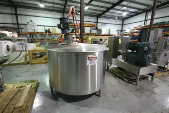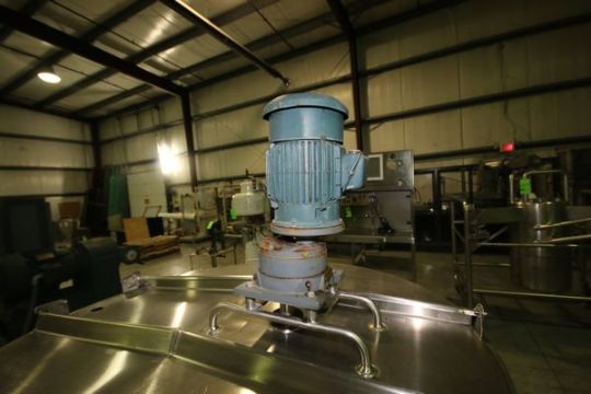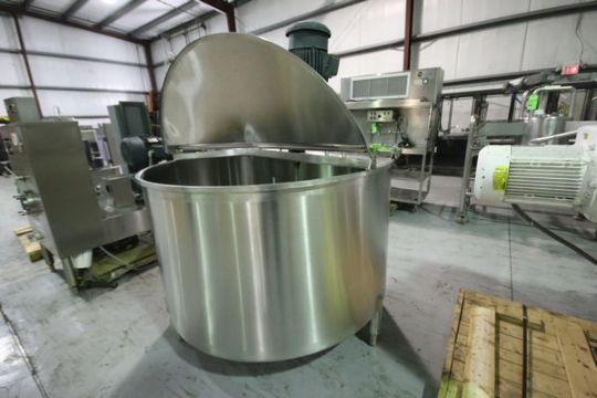 Crepaco Aprox. 500 Gal. S/S Mix Tank, S/N A2953 with Inverted Dish, 5 hp Off Center Squirrel Cage Blade Agitator, (2) Hinged Lids and S/S Legs