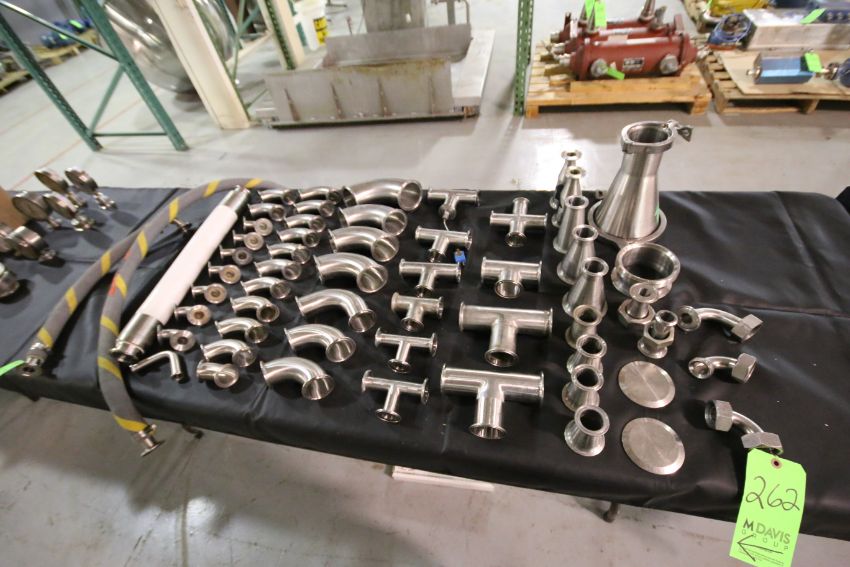 (59) Pcs. - Assorted Clamp Type Sanitary Grade Fittings and Hoses, Some Threaded includes: Elbows, T's, Reducers, Cross and Caps from 3/4" to 3"