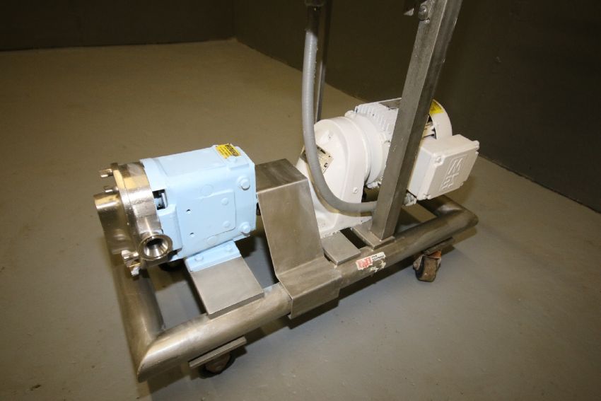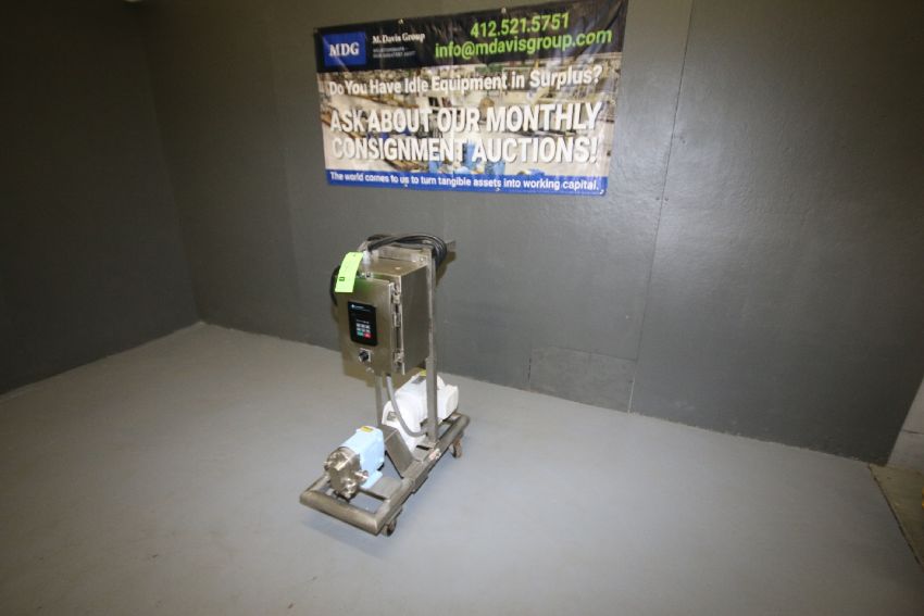 { Choice of lots: 41,42,43,44 } Waukesha Positive Displacement Pump, Model 1S, S/N 87144 SS with 1-1/2" x 1-1/2" Clamp Type S/S Head and 1 hp Gear Motor, Mounted on S/S Portable Skid with Allen Bradley Controls and VFD, 230/460 V, 3 Phase
