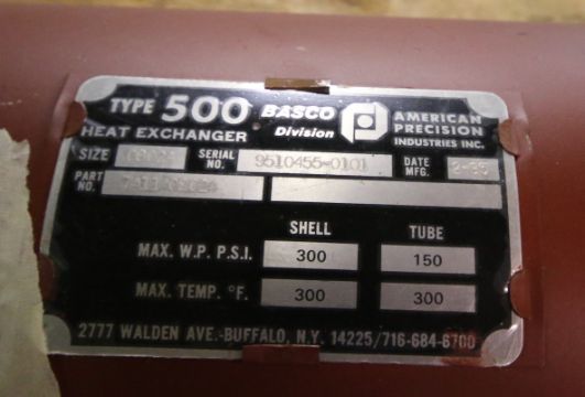 { Group of lots: 245,246,247 } Basco 22-1/2" L Shell and Tube Heat Exchanger, Type 500, Size 08024, S/N 9510455-0101 with S/S Bundle, Max Temp. 300 Degree F, MWP psi 300 Shell and 150 Tube