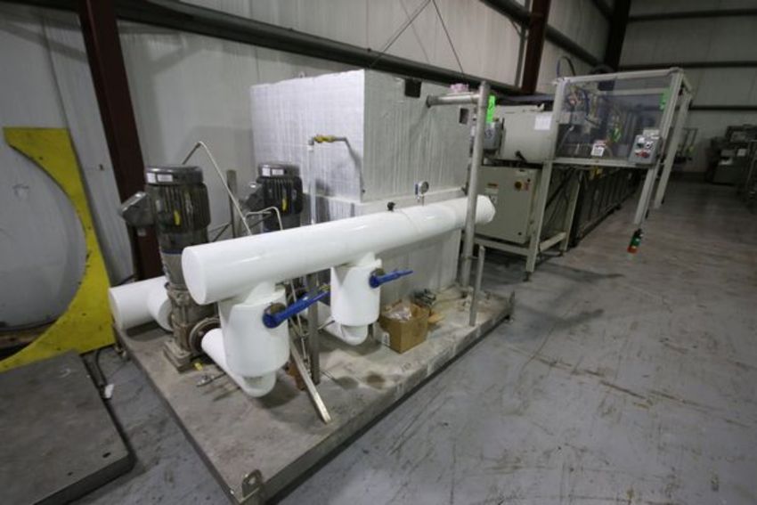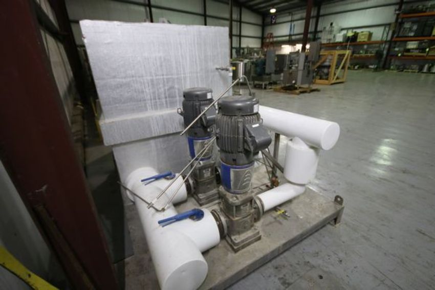 Skid-Mounted Glycol Holding Tank with Aprox. 600 Gal. Square Tank, (2) Goulds 15 hp Series SS V Pumps, Valves and Piping (Tank Dimensions Aprox. 4 ft. W x 4 ft. Deep x 63" H)