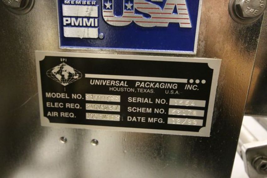 Universal Series 1500 Vertical Form, Fill, and Seal, Model C99, S/N 1554 with Omron Sysmac CQM1 Controls, Touchpad Display and Waukesha Positive Displacement Pump, Model 030 (Formerly Set-Up to Fill 1 Pouch of Liquid Fruit)