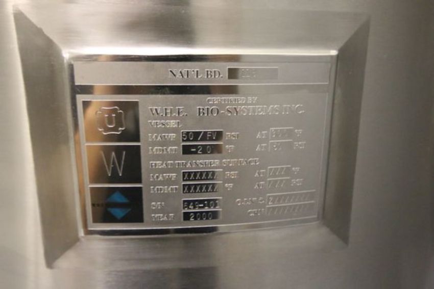 { Choice of lots: 64,65 } W.H.E. Bio-Systems Aseptic Aprox. 150 Gal. S/S Jacketed Tank, National Board #118, S/N 649101, MAWP 50 psi @ 300 F, Aprox. 24" D X 30" S/S Coned Bottom Open Top, Mounted on Portable S/S Frame (NOTE: Missing Top Cover)