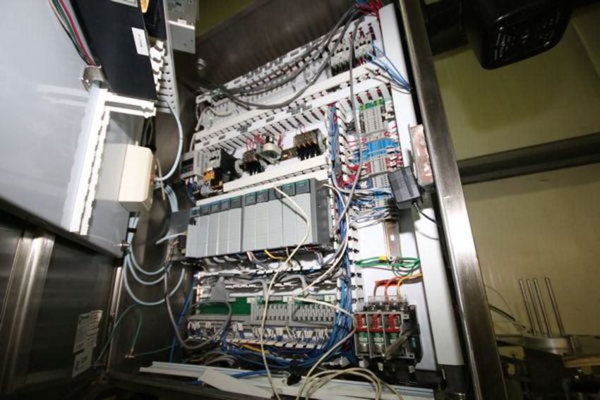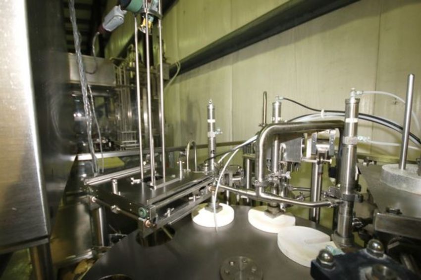 Osgood 8-Station Cup Filler, Model 1001-D, S/N 03-461, Set-Up for 6" Diameter Cups, with Allen-Bradley 10-Slot PLC Rack and Allen-Bradley PanelView, 480 Volts (NOTE: Missing Bowl and Pistons)