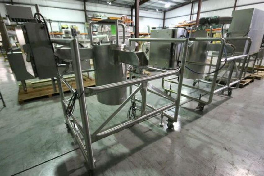 { Choice of lots: 104,105 } Aprox. 50 Gal. S/S Batch Tank, Mounted on Metttler Toledo Load Cells with Digital Read Out, Part #TB600529-3 and S/S Portable Frame (NOTE: Missing Agitator and Motor)
